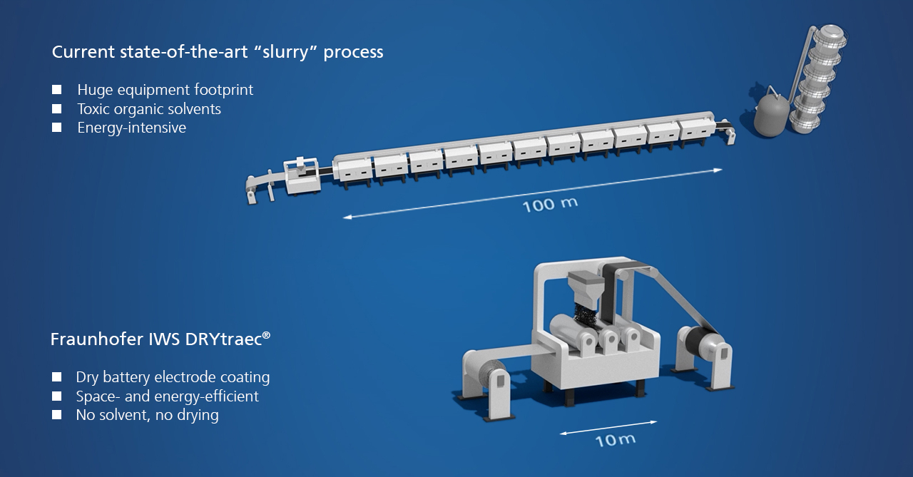 In today's battery electrode production, a so-called “slurry process“ is used. In this process, active materials, binders and conductive carbon blacks are processed with water or organic solvents to form pastes (slurries). Thin metal foils are coated with these slurries. The solvent is removed from the wet layer in up to 100 meters long drying sections. This requires a lot of space and energy, so that dry coating processes are increasingly becoming the focus of cell manufacturers.
